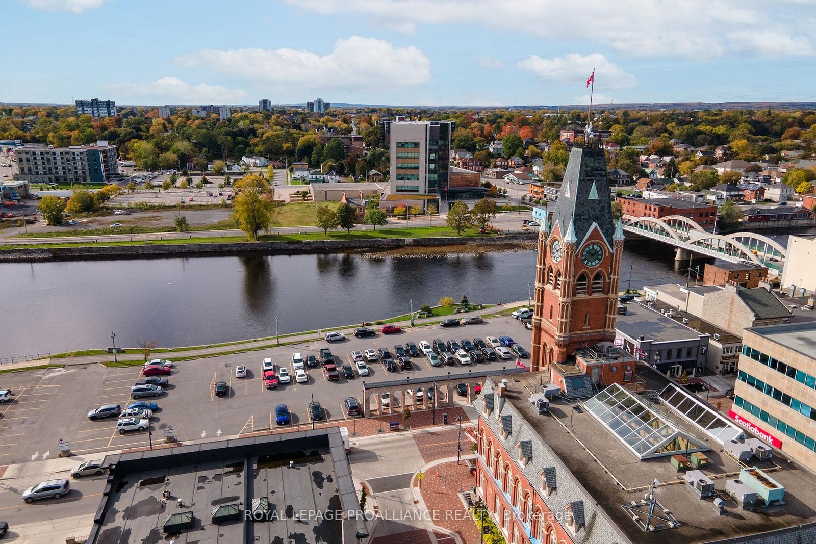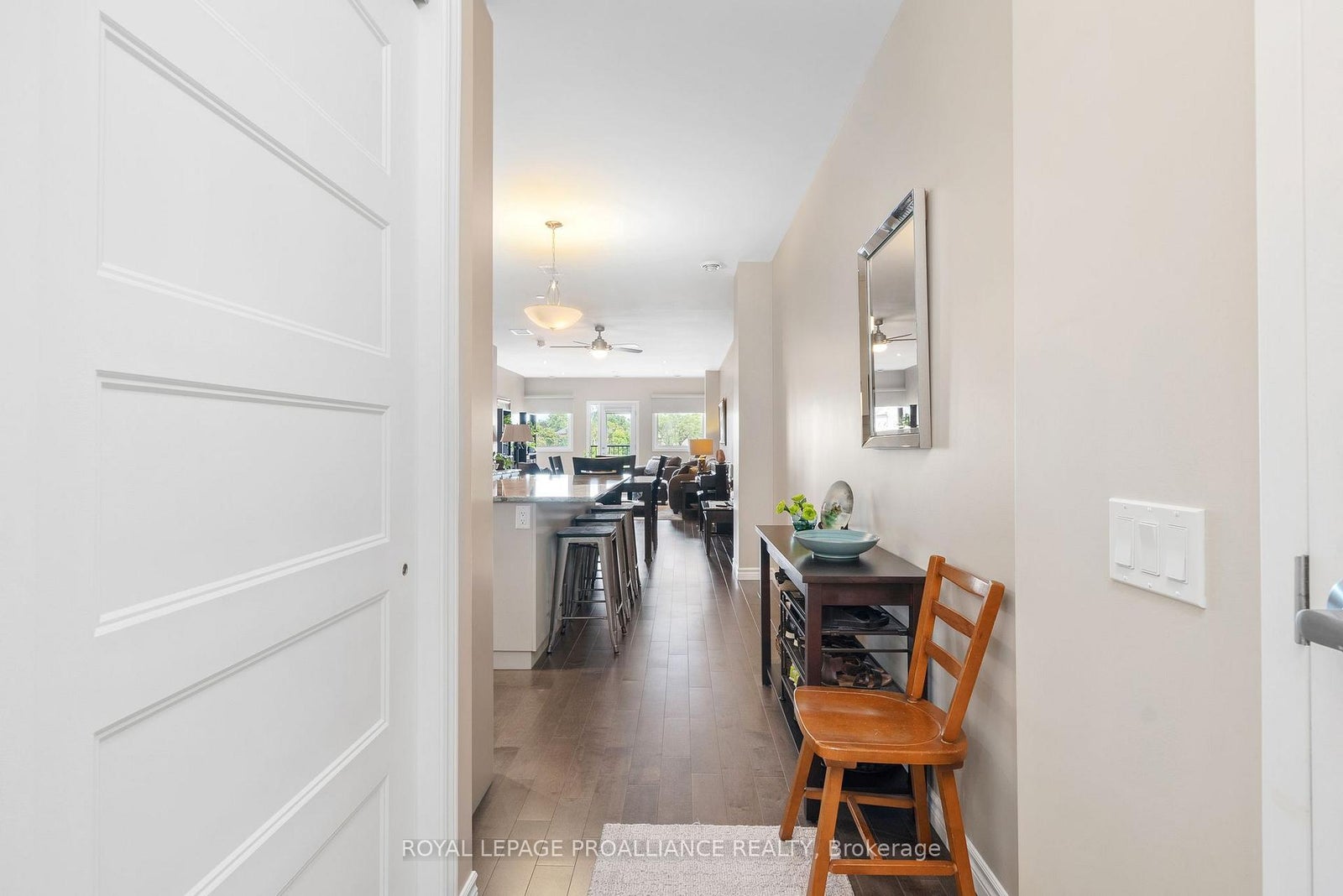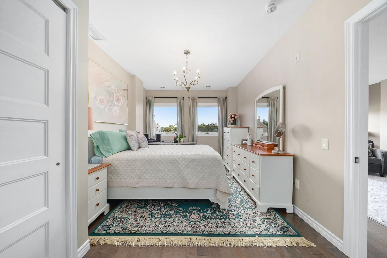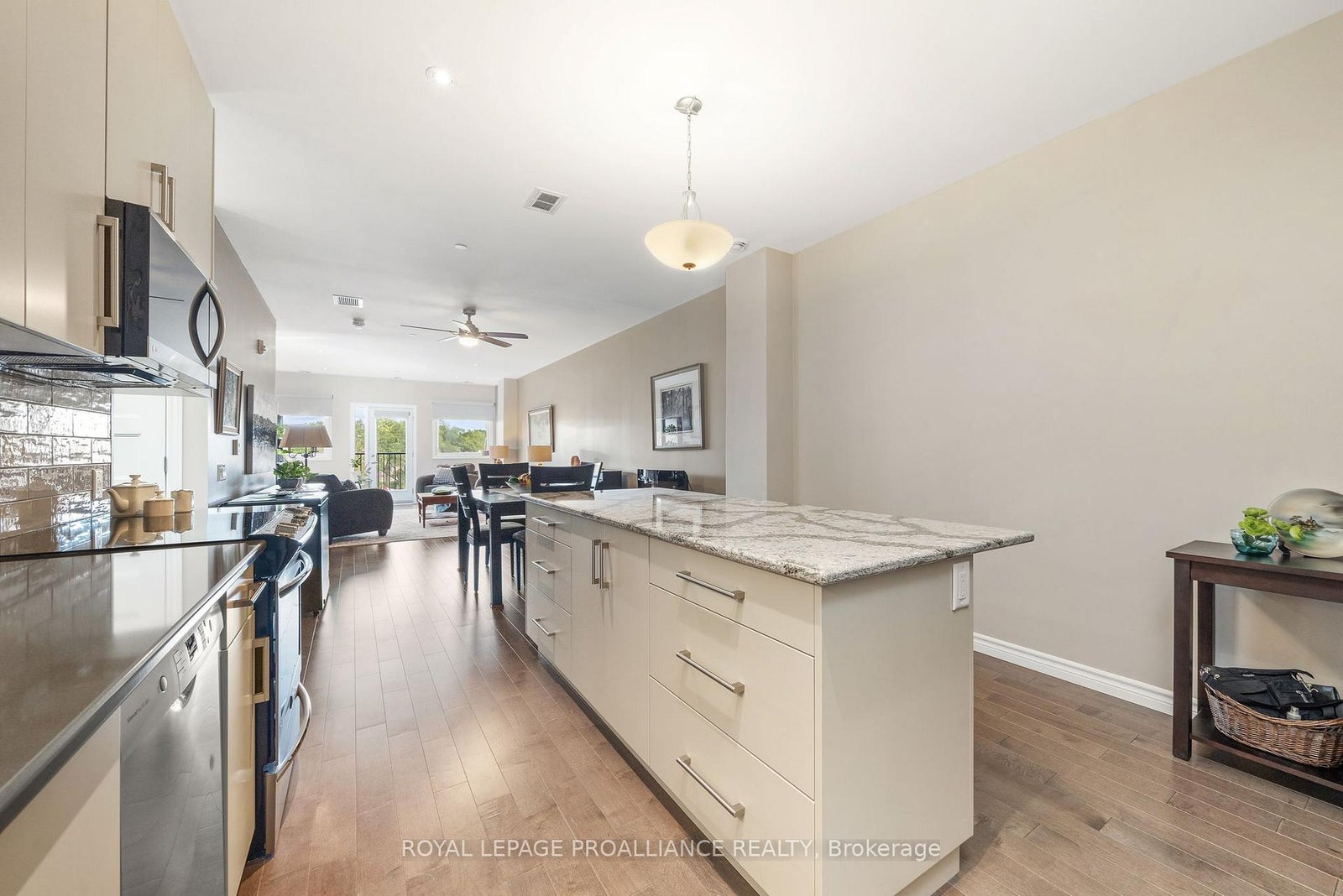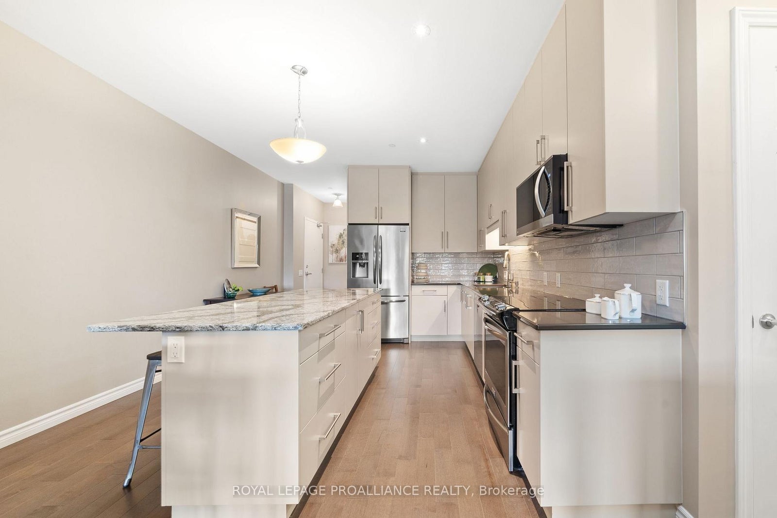 Welcome to Century Place/Village, where urban luxury meets effortless living in the heart of Belleville. This beautifully maintained fourth-floor condo offers a bright, open- concept layout with one bedroom plus den, featuring a spacious primary suite with a stylish ensuite. The modern kitchen boasts quartz countertops, sleek cabinetry, and a large island, flowing seamlessly into sun-filled dining and living areas with views of Belleville's vibrant downtown. Enjoy the convenience of in-suite laundry and premium upgrades throughout. Residents of Century Place/Village enjoy exceptional amenities including a 3rd floor rooftop patio with BBQ and city views, adjoining common room with kitchen, main floor fully equipped fitness center with cafe (fee), secure access, heated underground parking, and a wine bar on the main level. Ideally located near the revitalized market place armories with restaurants, shops, and entertainment, this condo is perfect for young professionals or retirees seeking a sophisticated, low-maintenance lifestyle. Compliments of the current owner, enjoy a 3 month membership to the gym upon closing.