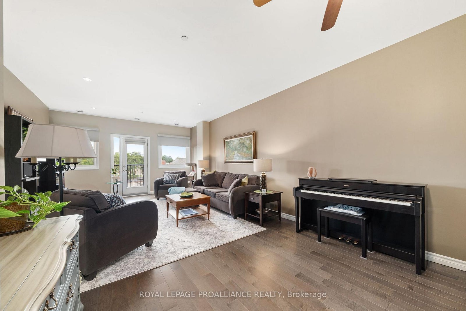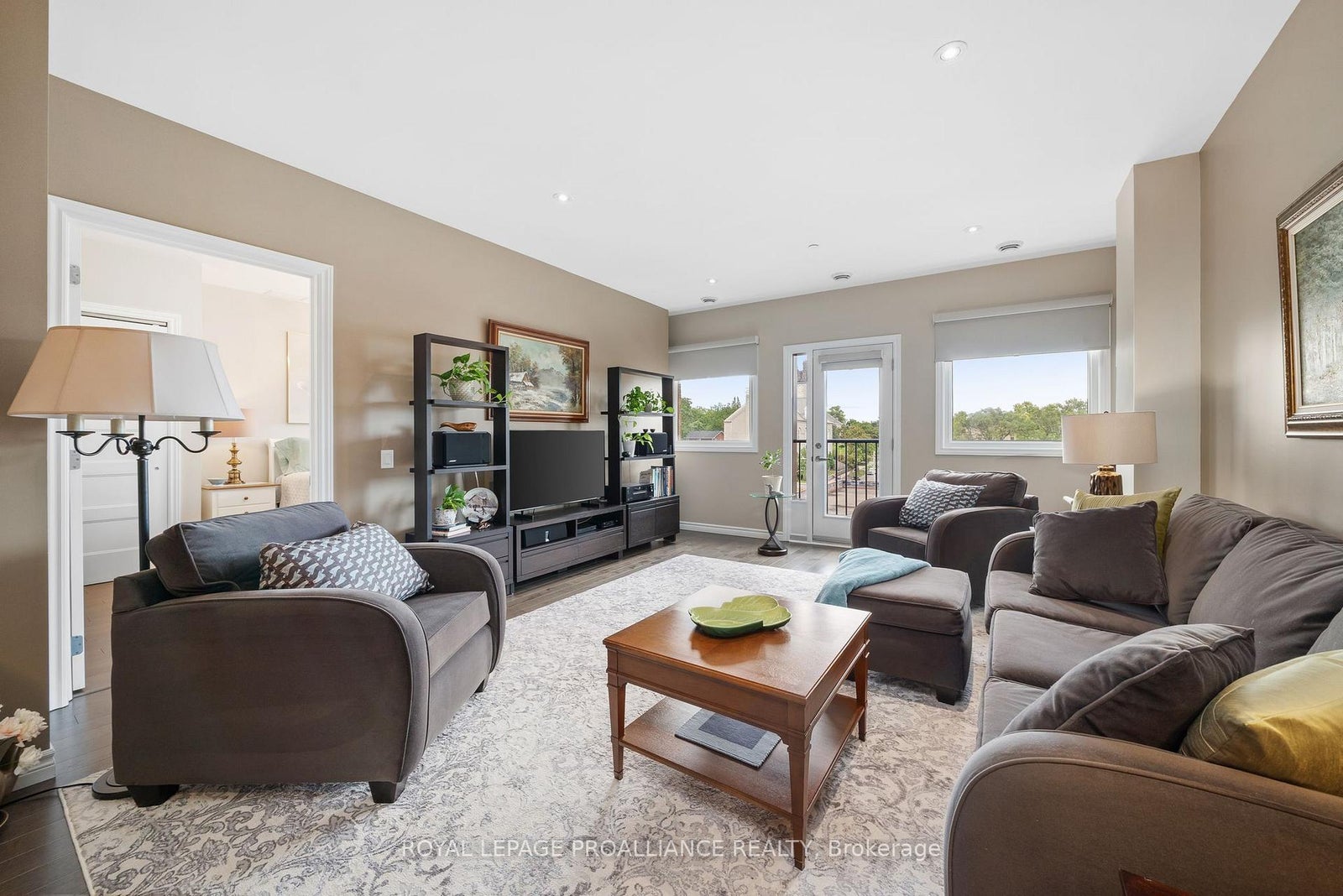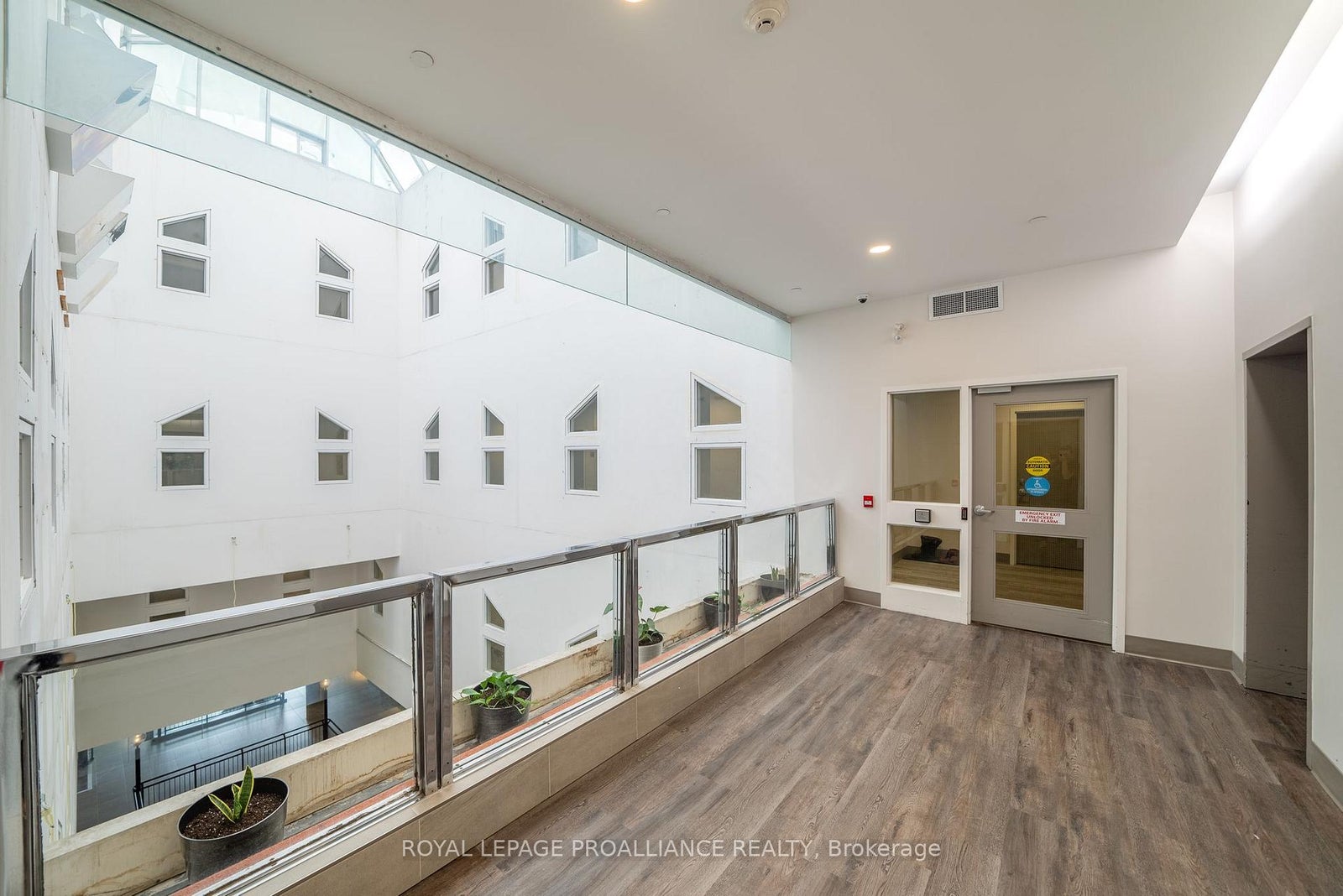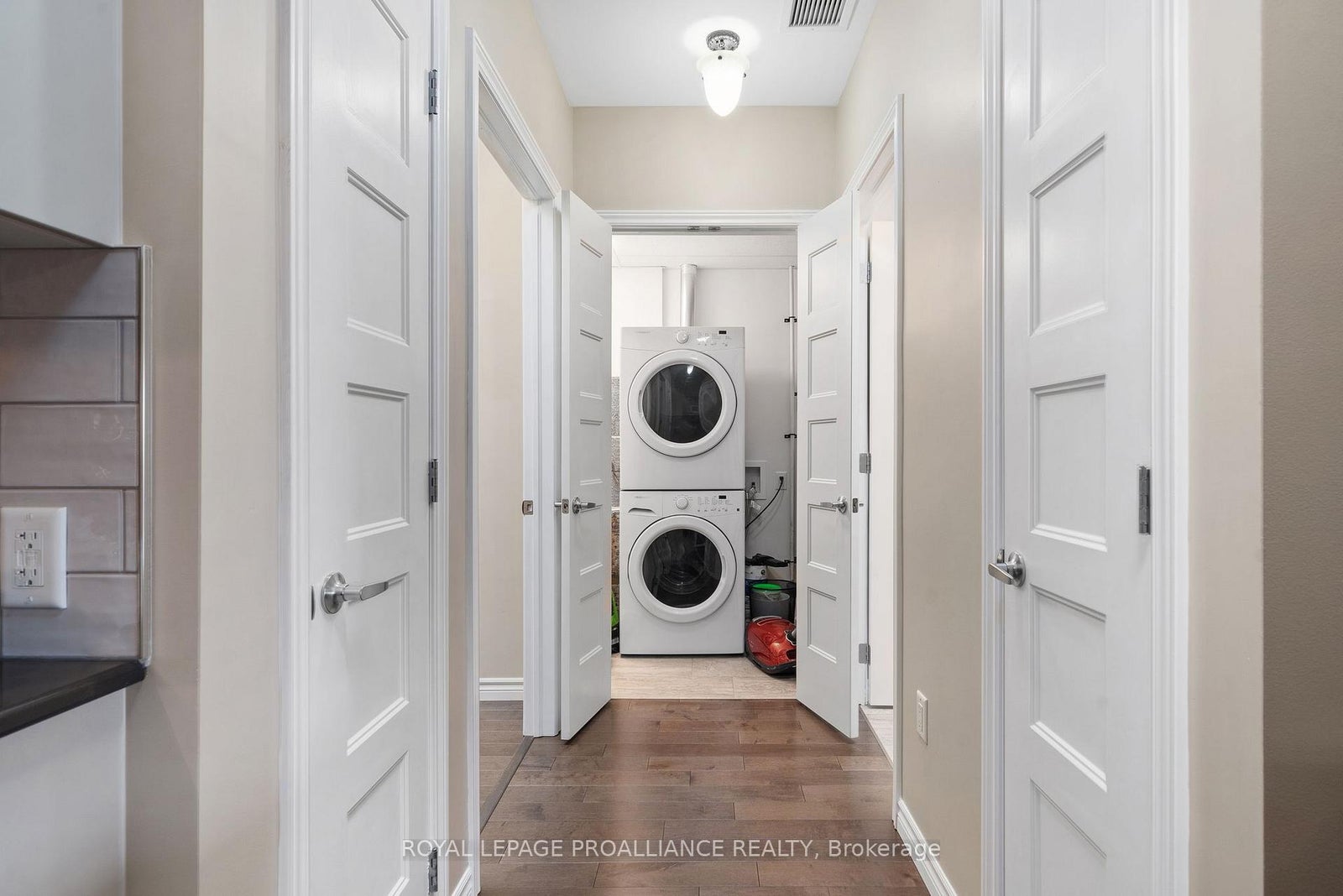Welcome to Century Place/Village, where urban luxury meets effortless living in the heart of Belleville. This beautifully maintained fourth-floor condo offers a bright, open- concept layout with one bedroom plus den, featuring a spacious primary suite with a stylish ensuite. The modern kitchen boasts quartz countertops, sleek cabinetry, and a large island, flowing seamlessly into sun-filled dining and living areas with views of Belleville's vibrant downtown. Enjoy the convenience of in-suite laundry and premium upgrades throughout. Residents of Century Place/Village enjoy exceptional amenities including a 3rd floor rooftop patio with BBQ and city views, adjoining common room with kitchen, main floor fully equipped fitness center with cafe (fee), secure access, heated underground parking, and a wine bar on the main level. Ideally located near the revitalized market place armories with restaurants, shops, and entertainment, this condo is perfect for young professionals or retirees seeking a sophisticated, low-maintenance lifestyle. Compliments of the current owner, enjoy a 3 month membership to the gym upon closing.